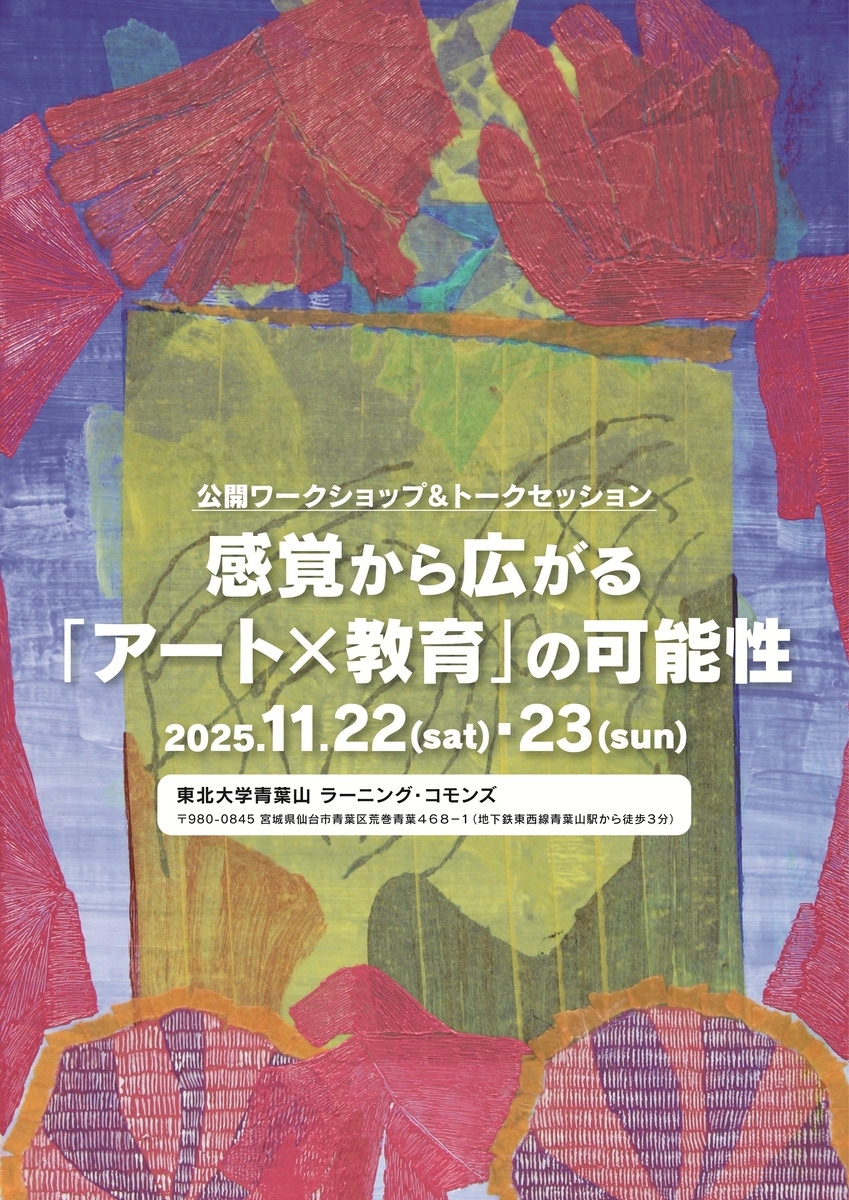今回の『ワークショップ&トークセッション 感覚から広がる「アート✕教育」の可能性』(11月22,23日/青葉山コモンズ)は、言語・身体・感覚から広がる自由な表現を可能にし、そこから新たな出会いや発見をもたらす多様なアート✕教育の試みを、教育の未来を考える機会にしたいと開催されるものです(詳細は、下記のチラシをご覧ください)。