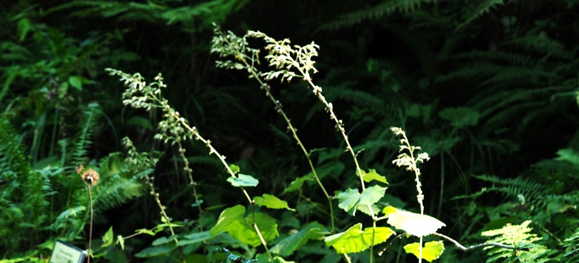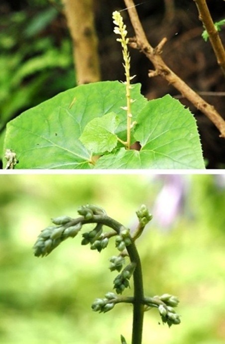 オオカニコウモリという名は、その葉の形がカニの甲羅に似ていることに由来します。針葉樹林やブナ林の薄暗い森林帯に群生し、山菜としても食用にされます。