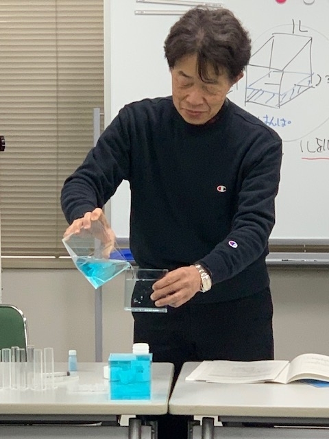 さらに《えっ何で?》と不思議に思いませんか。これ算数の授業ですよ。なのにまるで理科の授業のように青い液体を容器に移したり、かと思うと ♪ ダイコン一本、片手に持ぉっ~て ♪ と、まるで家庭科の授業?という感じです。
