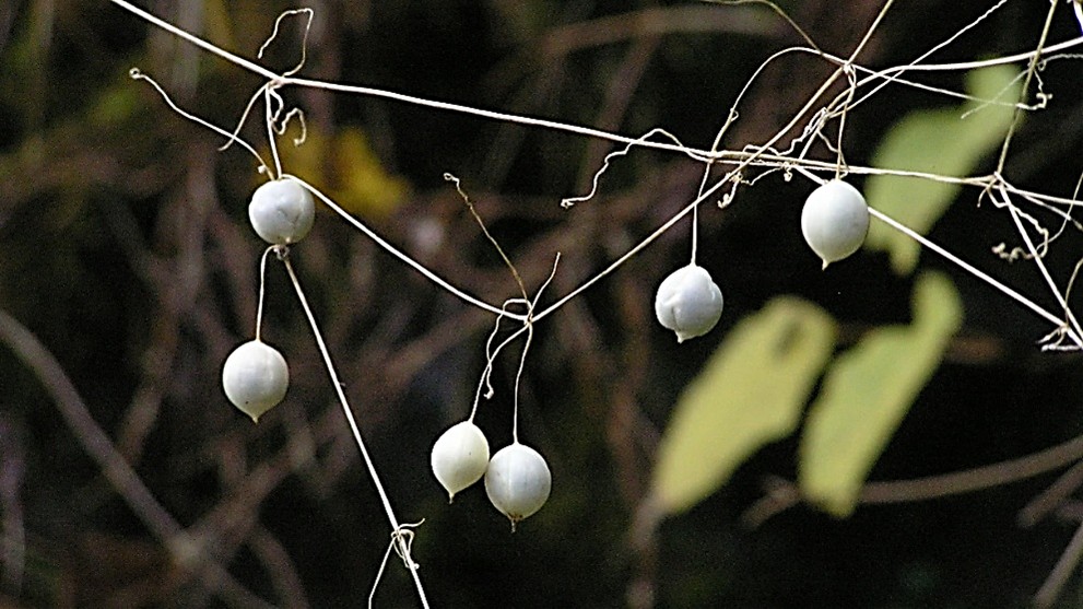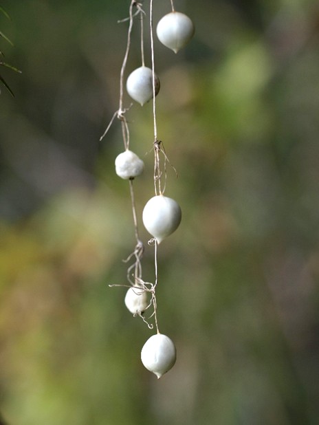 近づいてみると、糸のような細いつるに、小さな白い実がいくつもぶら下がっているのが目に入りました。