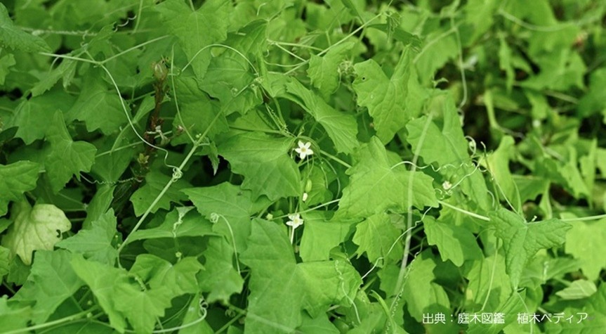 地中から芽を出すと、細い茎はつる状に伸び、まるで何かを探すように周囲へ広がっていきます。つる植物にとっての第一の生存条件は、周囲の植物より先に光を浴びることです。いち早く日当たりのよい場所を確保しようとしているのでしょう。